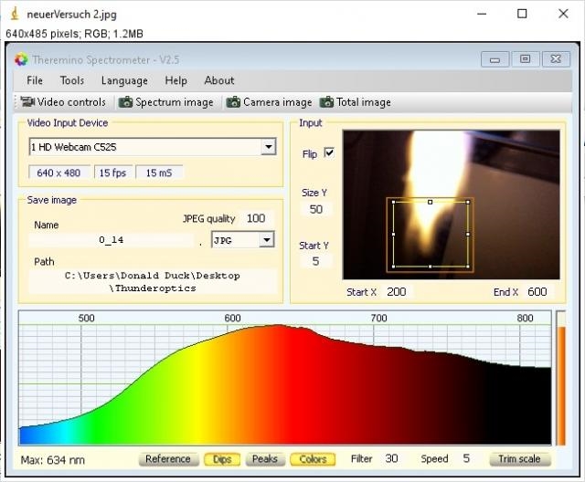 das ist richtig. Die Flamme steht Kopf, weil die Kamera falsch herum gedreht war. Gemessen wurde offenbar die Wellenlänge in dem orange eingerahmten Rechteck. Das lässt sich über die x- und y-Werte einstellen. Es gab kein Lithiumrot, und das wurde auch nicht gemessen. Besten Dank für die Nachhilfe, denn in der Hilfedatei stand das nicht. Es dauerte nicht lange und die Farbe ging in Natriumgelb über.