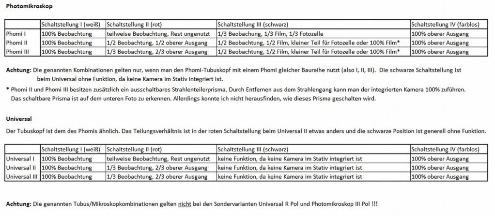 Eine Unstimmigkeit ist mir noch aufgefallen: Das Teilungsverhältnis in Schaltstellung II beim Phomi III wird von Zeiss einmal mit 1/3 zu 2/3 und das andere Mal mit 20%/80% angegeben. Ob es diesen Unterschied nur in den Druckschriften gab, oder ob da noch mal was geändert wurde, weiß ich leider nicht.