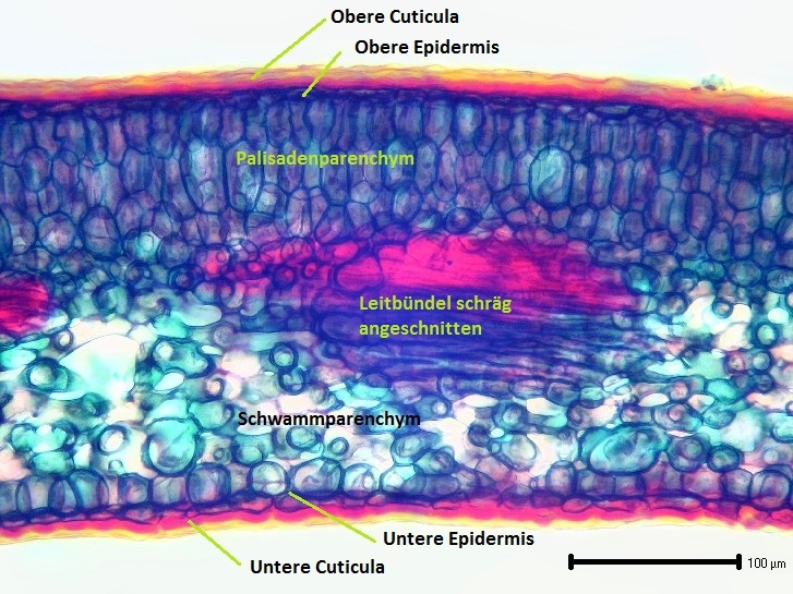 Nun noch zu den Blättern des Buchsbaums. Diese erwiesen sich als schwer zu präparieren, da sich die untere Epidermis mit dem Schwammparenchym vom Palisadenparenchym mit den aufsitzenden Leitbündeln ablöst.