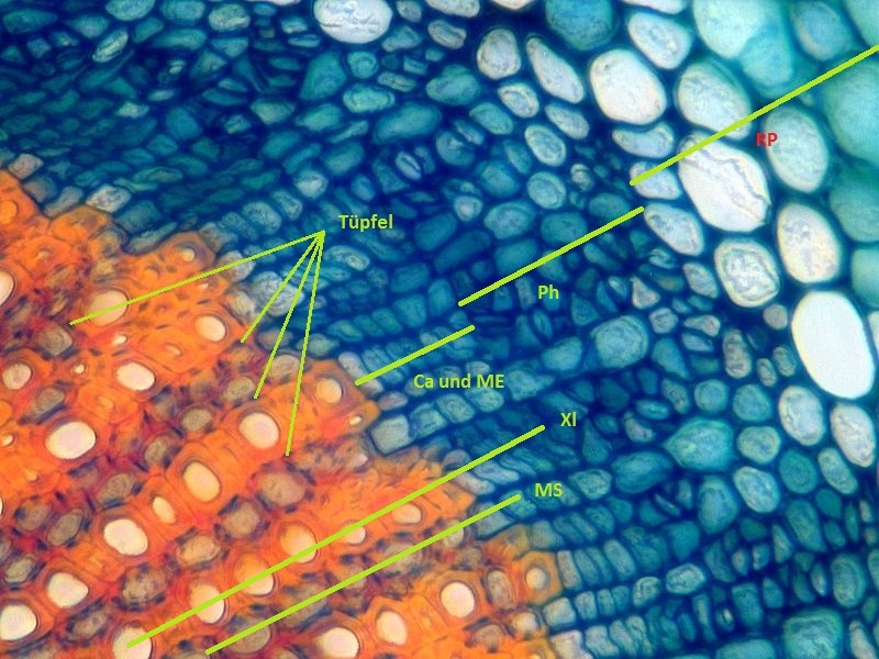 Die Markstrahlen treten bei der SAC Färbung als dunkelrote Zellreihen zwischen dem orangeroten Xylem hervor, was man im nachfolgenden Bild bei höherer Vergrößerung etwas besser erkennen kann. Der Übergang zwischen dem Kambiumgewebe beziehungsweise merestematischen Gewebe zum Xylem ist unregelmäßig gebaut. Jeweils dort wo eine undifferenzierte blaue Zelle in den orangen Xylemring hineinragt, liegt ein Markstrahl. In der Regel sind sowohl Xylem als auch die Markstrahlen jeweils 1 bis 2 Zellreihen dick.