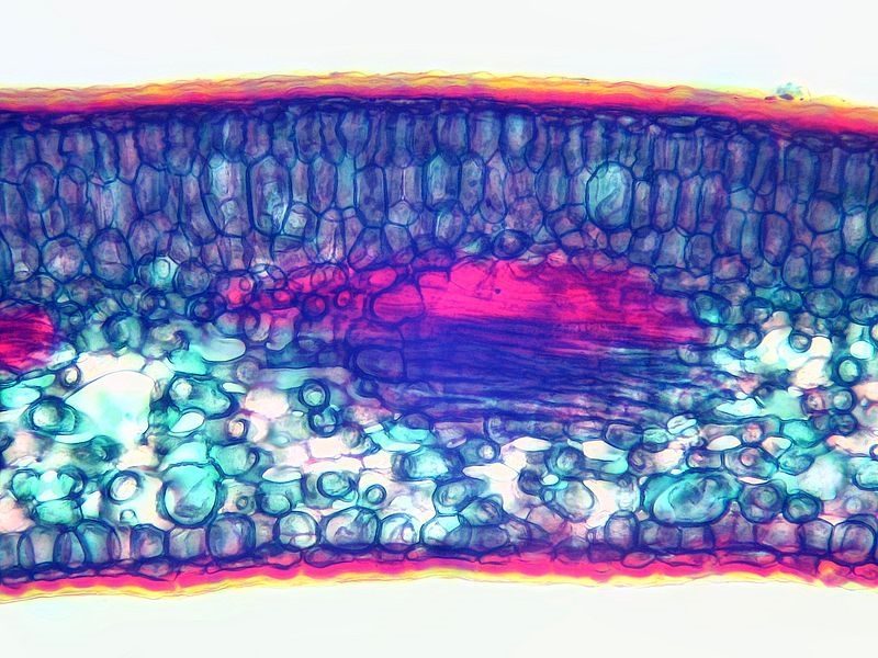 Hier, wie eben angekündigt, noch ein größerer Bildausschnitt aus dem Präparat des Blattquerschnittes. Leider mit den typischen Schwächen des 'kleinen' Objektives (Leica N-Plan 5x).