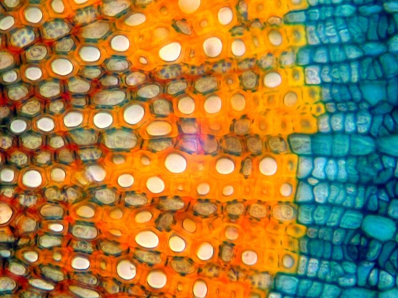 Färbt man mit AcriBER, treten die Markstrahlen dunkelrot zwischen dem grünen Xylem hervor. Frisches Präparat, leider saufen die Rottöne im Bild ab, warum das so ist, kann ich mir nicht erklären.