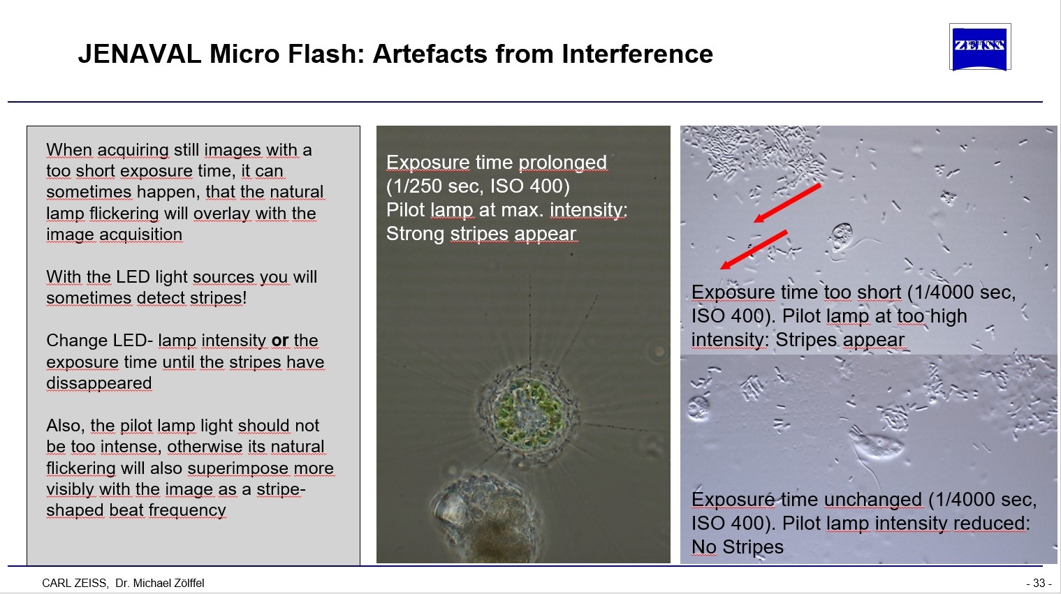Die Streifen kann man beseitigen, indem man für jedes Objektiv und jedes Kontrastierungsverfahren einmalig die geeignete Kombination aus Helligkeit des Lampenlichts und der Verschlußzeit ermittelt, bei der keine Streifenartefakte auftreten.