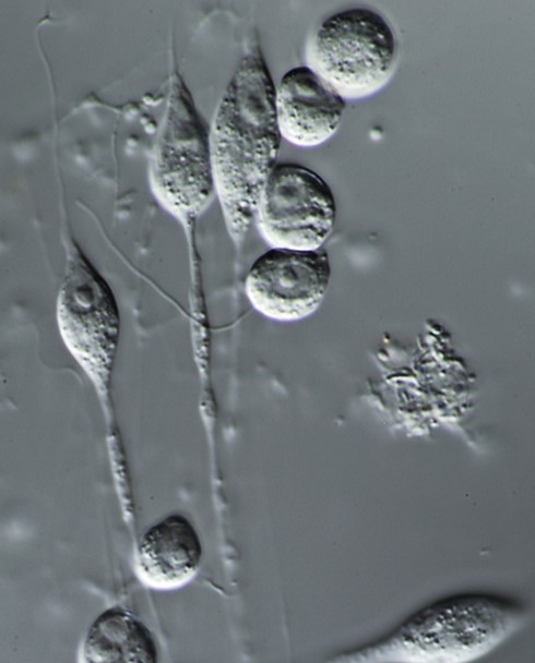 Cercomonas granulifera, Syncytienbildung. Aufnahme: Steffen Clauß mit FUJIFILM- Kamera und JENA 250-CF Planachromat (fl) 100x/ 1,30 mit JENAVAL DIK.