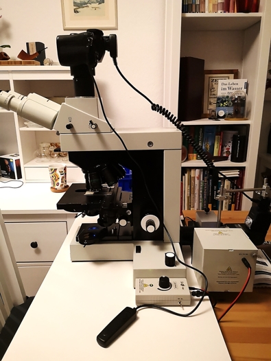 Ich benutze ein Phomi III aus der letzten Serie (Baujahr 1986) mit AC-Stativ (hier ist die Kamera komplett erschütterungsfrei vom Mikroskop entkoppelt). Seit einiger Zeit habe ich auch wieder ein JENAVAL (Baujahr 1988). Das habe ich damals beschafft/ kaufen lassen (zusammen mit weiteren JENAVALen und einem JENAVAL contrast, für damals mehr als 150000 DM), zwischenzeitlich war es fast 30 Jahre lang "verschollen" und ist dann doch im Originalzustand und völlig unversehrt zu seinem "alten Herrchen" zurückgekehrt....