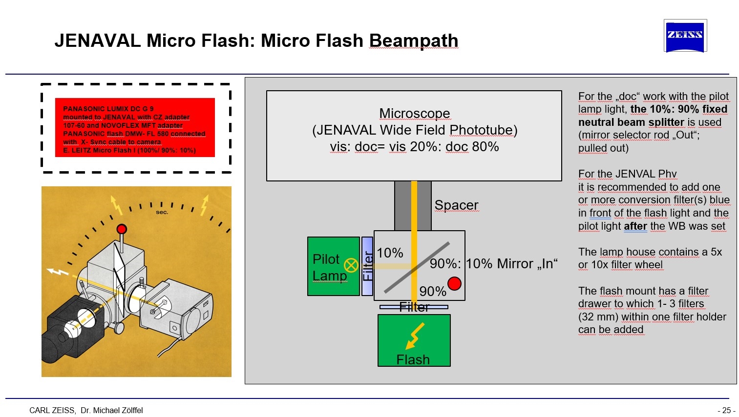 Am JENAVAL benutze ich einen, von Jürgen Stahlschmidt umgebauten Mikroblitz I von ERNST LEITZ, Wetzlar aus den 1950er Jahren. Der hat den Vorteil eines Spiegelsystems mit 100% Pilotlicht oder 90% Blitz: 10% Pilotlicht. Spätere Ausführungen bekamen dann andere Teilungen (70:30 und 80:20). Der JENAVAL- Fototubus hat eine 20% vis: 80% doc- Stellung. Mit dieser Anpassung von Jürgen Stahlschmidt ist man auch zukunftsicher, da kein Blitzgerät umgebaut werden muss. Beim CZO Doppelkollektor ist das anders.