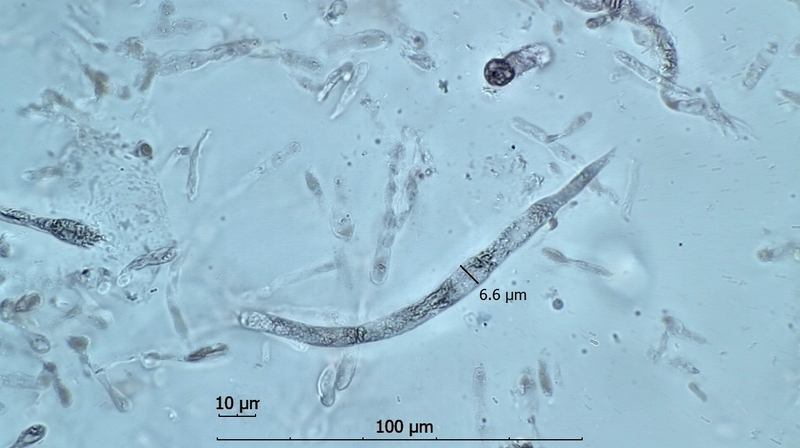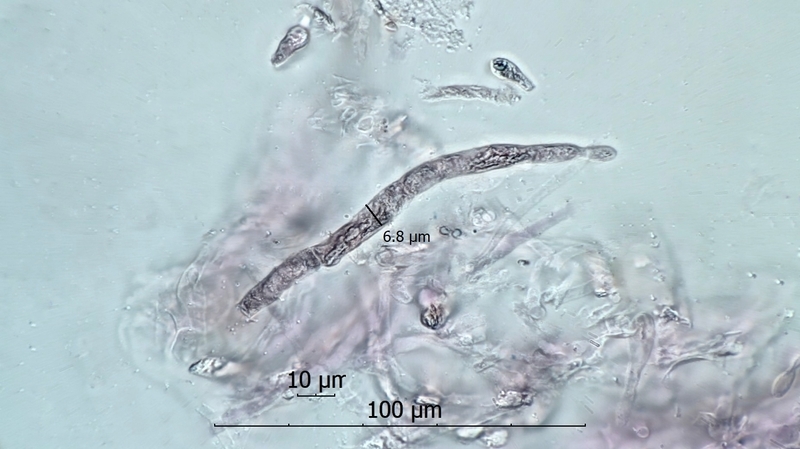 •    Die eigene Sporenmessung (s.o.) weist gegenüber der Fachliteratur recht kleine Sporen aus. Dies ist möglicherweise darin begründet, dass die Sporen vom Exsikkat abgenommen wurden und z.T. noch unreif waren.