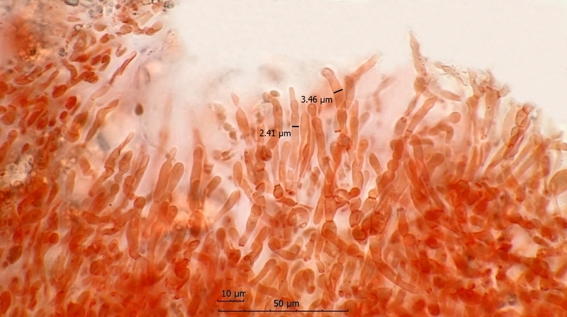 Die Epikutis besteht zum einen aus langen, schlanken, mehrfach septierten, unverzweigten, apikal verdickten, verjüngten oder gerundeten, 2-4 µm breiten Epikutishaaren. Manche dieser Haare sind geradlinig, andere angedeutet moniliform (perlschnurartig) (Bild 7). Zum anderen besteht die Epikutis aus langen, zylindrischen,  apikal gerundeten, doch auch verjüngen oder mit köpfchenartiger Verlängerung versehenen Pileozystiden. Sie sind meist ein- bis dreizellig, in Sulfovanillin grauendend und bis etwa 7 µm breit (Bilder 8 und 9). Beide Elementtypen sind in eine zähschleimige Huthautmasse eingebettet.