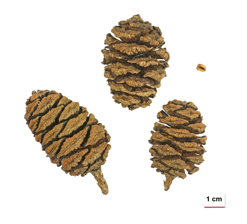 Bild 04 Reife Zapfen und ein Same, Riesenmammutbaum Sequoiadendron giganteum