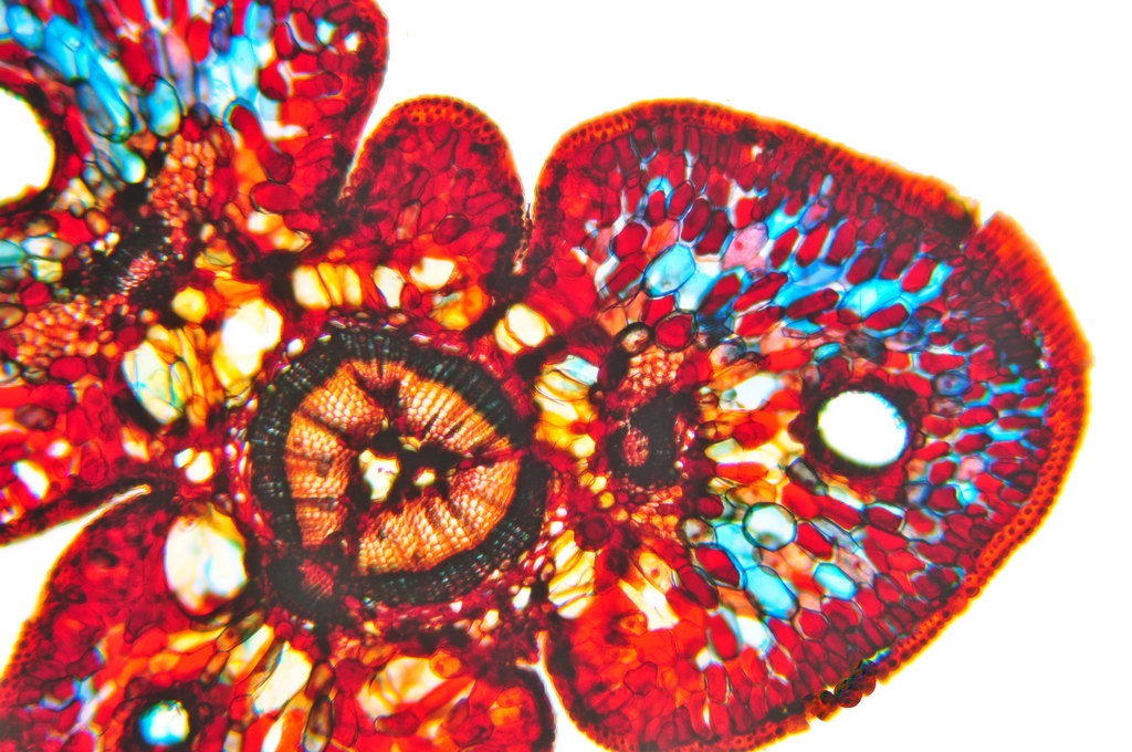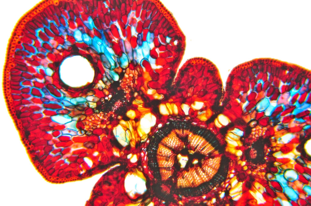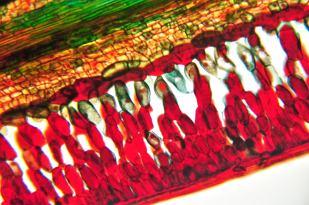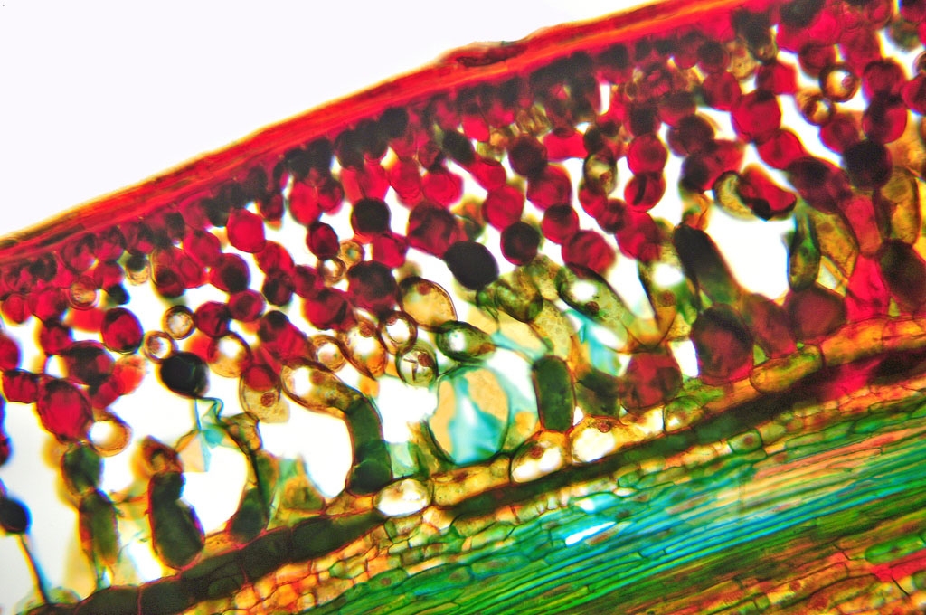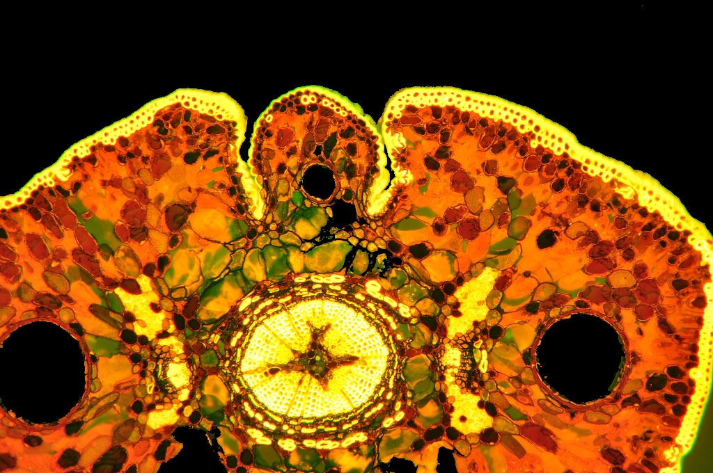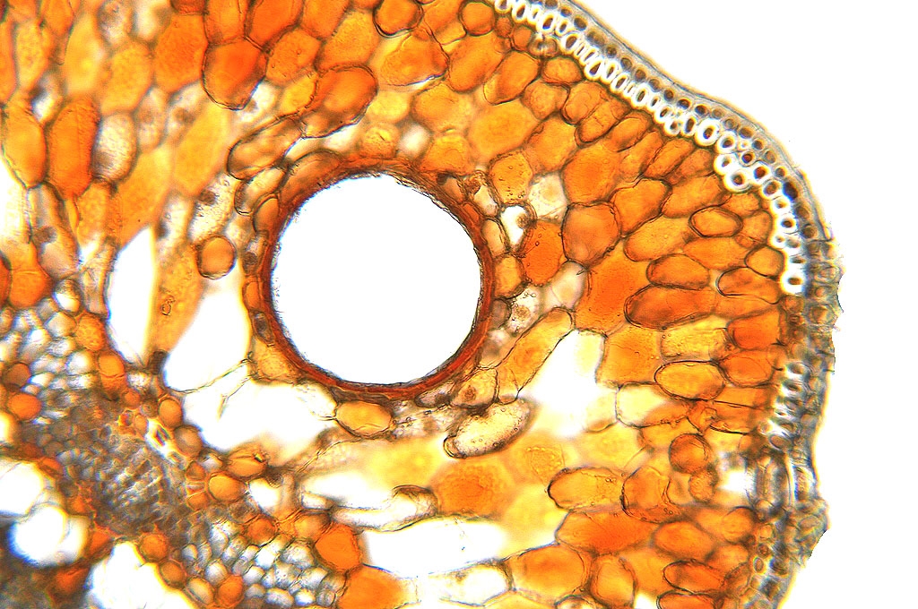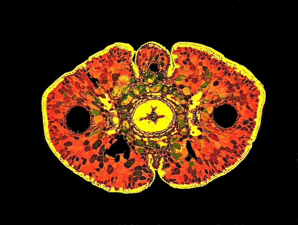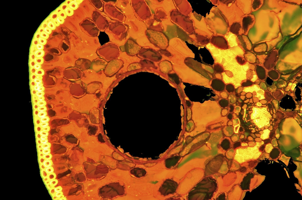 Zellwände blaugrün bis grün, verholzte Zellwände leuchtend rot, Zellwände der äußeren Hypodermis orangerot, Cuticula gelb, Zellwände der innenliegenden Hypodermis tiefrot.