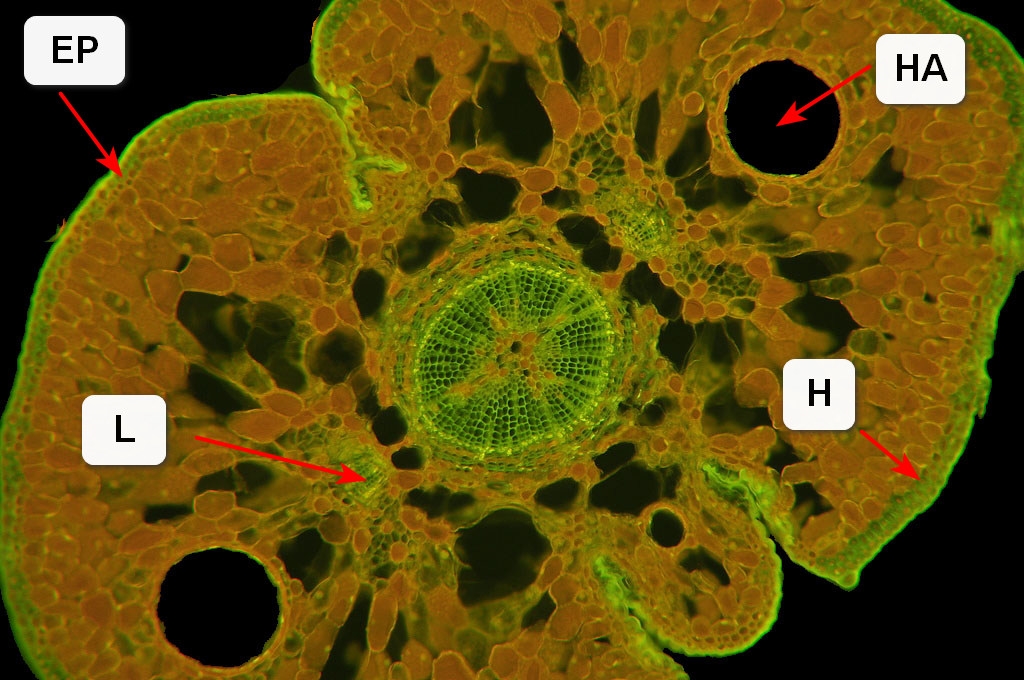 EP = Epidermis, HA = Harzkanal, H = Hypodermis, L = Leitbündel