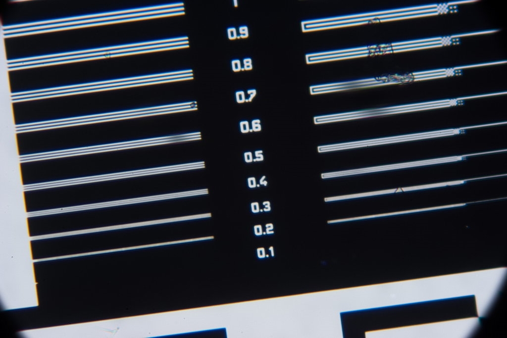 Die Auflösung in Linienpaaren/mm erhalte ich, wenn ich 500 Lp/mm durch die Zahl bei den Mustern teile, z. B. "2" bedeutet 250 Lp/mm.