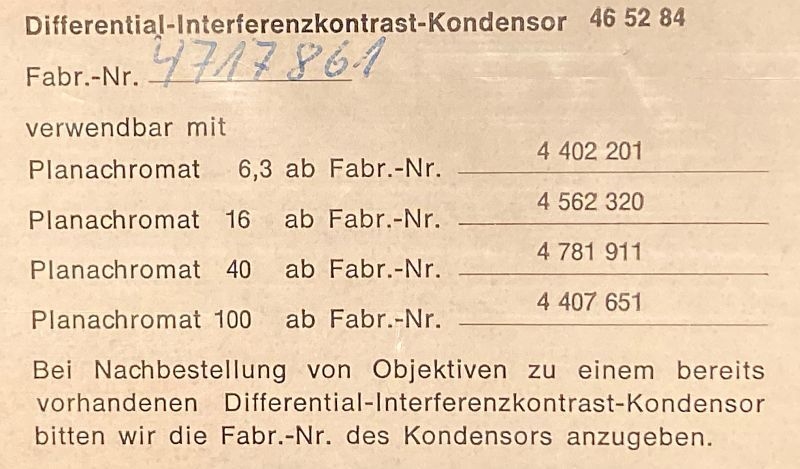 weiter so! Ich weiss nicht ob du die kleinen Zettel kennst die Zeiss den INKO Kondensoren beigegeben hat und die auf die Produktionsnummern kompatibler Objektive hinweisen. Es wäre gut wenn du die Produktionsnummer deines Kondensors sowie die Produktionsnummern der Zeiss Plan Objektive (sofern vorhanden) mit angeben könntest.