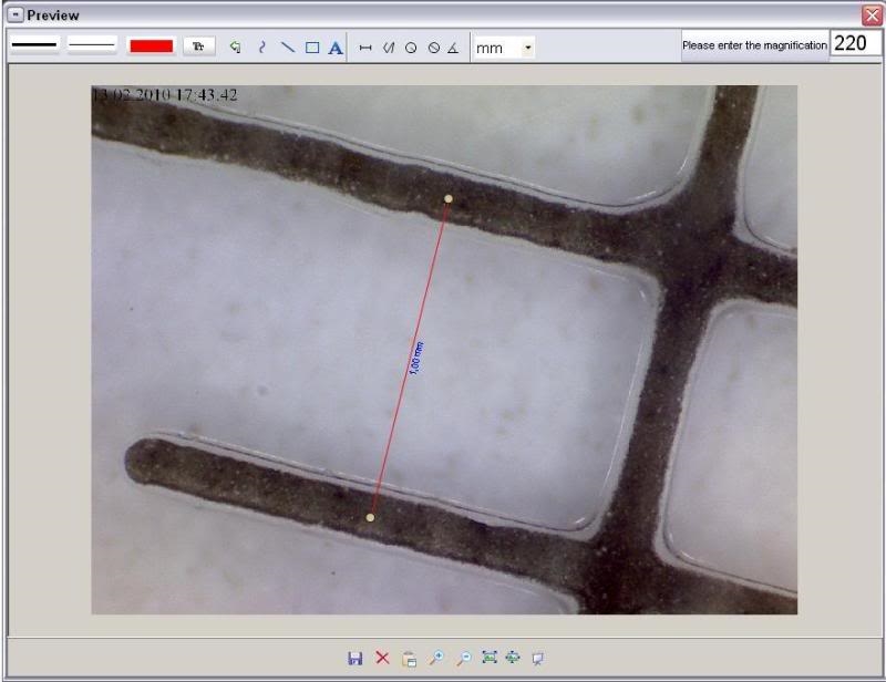 Die Messungen funktionieren gut und sind nach meinen Erfahrungen auch präzise und korrekt ( siehe die Messung des 1-mm-Abstandes an der Linealteilung ). Nach Erstellen eines Fotos gibt man in das Fenster für die Bildbearbeitung die am Handteil abgelesene Vergrößerung ein und misst dann einfach Strecken im Bild aus. Die Maßangabe kann als Mikrometer, mm, cm, m, km(!) inch und "pixels" erfolgen.