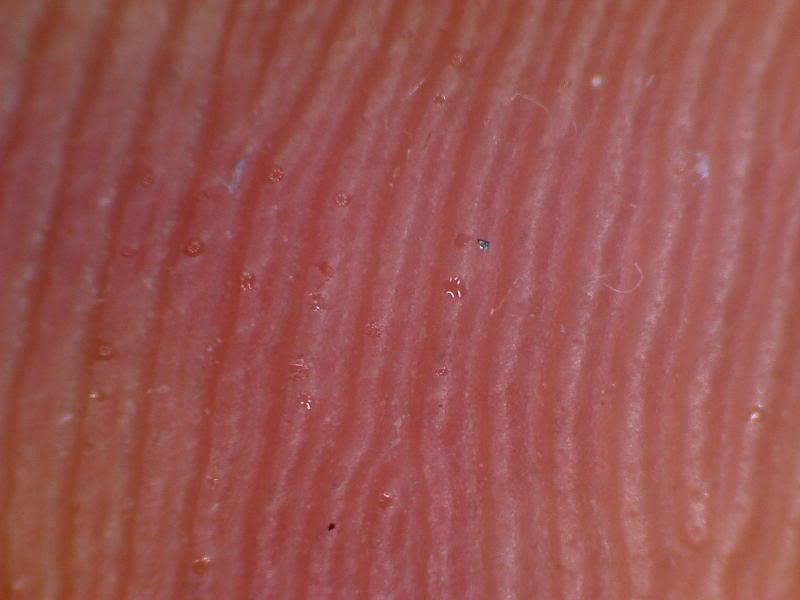 Bildung von Schwiessperlen auf der Fingerkuppe ( tatsächlich ließ sich "live"und eindrucksvoll beobachten, wie sich die Schweisstropfen langsam aus den Schweissdrüsengängen entwickeln und auch recht schnell wieder verdunsten )