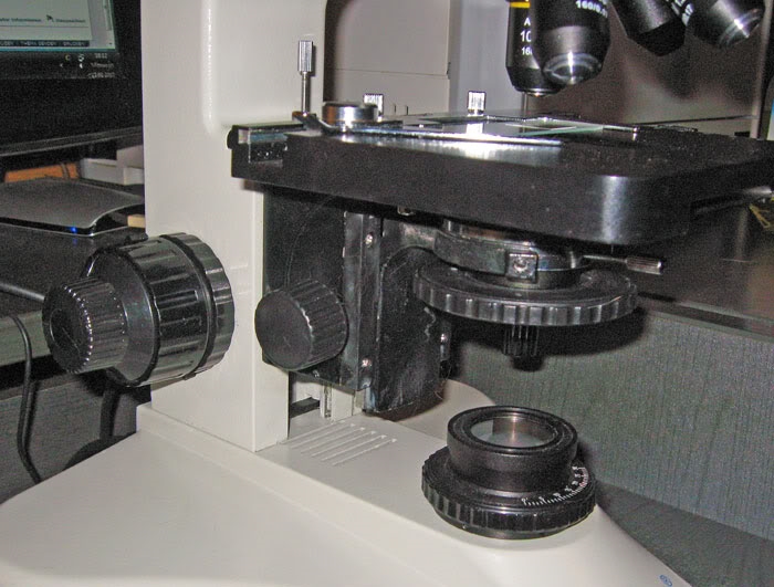 Wie allerdings schon Bernd bemerkt hat, sieht die Sache bei der Verwendung schwacher Objektive anders aus. Dann ist nämlich die Irisblende im Fuß (Stativblende) die Aperturblende und die Irisblende im Kondensor sollte offen bleiben (wenn nicht der Kondensor sogar entfernt werden muss).
