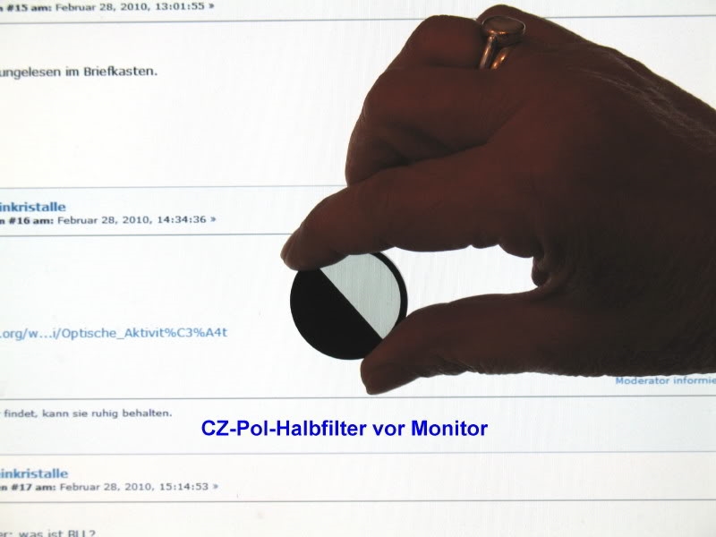 Zur Demo habe ich das Halbfilter genommen, überprüft habe ich mit einem CZ-Polfilter, der die Schwingungsrichtung auf der Fassung graviert trägt. Das Halbfilter eignet sich aber zur Veranschaulichung besser: