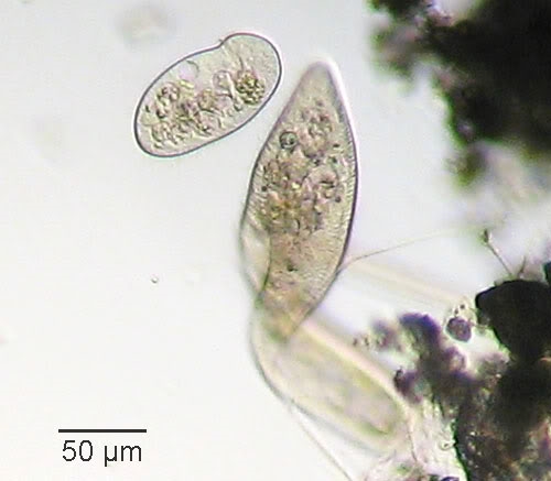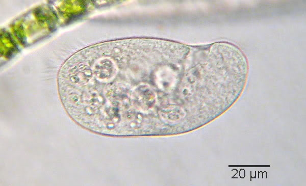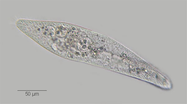 Bei dem großen Viech schaute ich gleich im Streble/Krauter nach und fand dort als mögliche Art nur Paramedium caudatum, wobei das dazugehörige Bild im Fototeil überhaupt nicht passt. Auch die Beschreibung der Bewegungen passt nicht, denn diese Tierchen (7 Exemplare in einer einzigen Probe) waren allesamt sehr träge, schwammen kaum ("rasch in weiten Schraubenlinien schon mal gar nicht") und versteckten sich bei Lichteinfluss unter Pflanzenteilen.