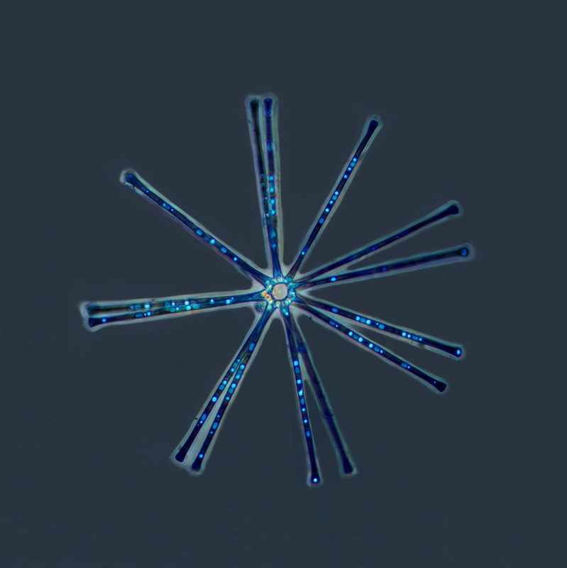 Die Planktonprobe (ohne Netz) war vom Herbstmaximum der Diatomeen geprägt. Besonders reichhaltig war das Angebot an Schwebesternen Asterionella formosa. Da sich dieses Spezier recht gut für den Phasenkontrast eignet und davon noch nicht sehr viele Bilder im Forum zu finden sind, möchte ich zwei Aufnahmen einstellen. Die erste ist im PH+ 40 angefertigt, sozusagen in situ, nur ein wenig der Kontrast angehoben, ansonsten kaum bearbeitet (Kurt wird sich freuen!).