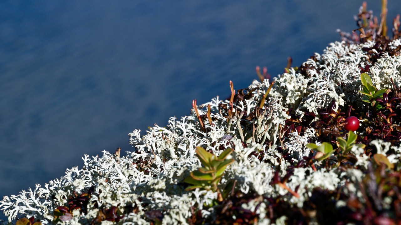 Die Uferzonen sind oft dicht bewachsen mit einem "Filz" aus Rentierflechten (Cladonia rangiferina), Preiselbeeren und Isländisch Moos (Certraria islandica).