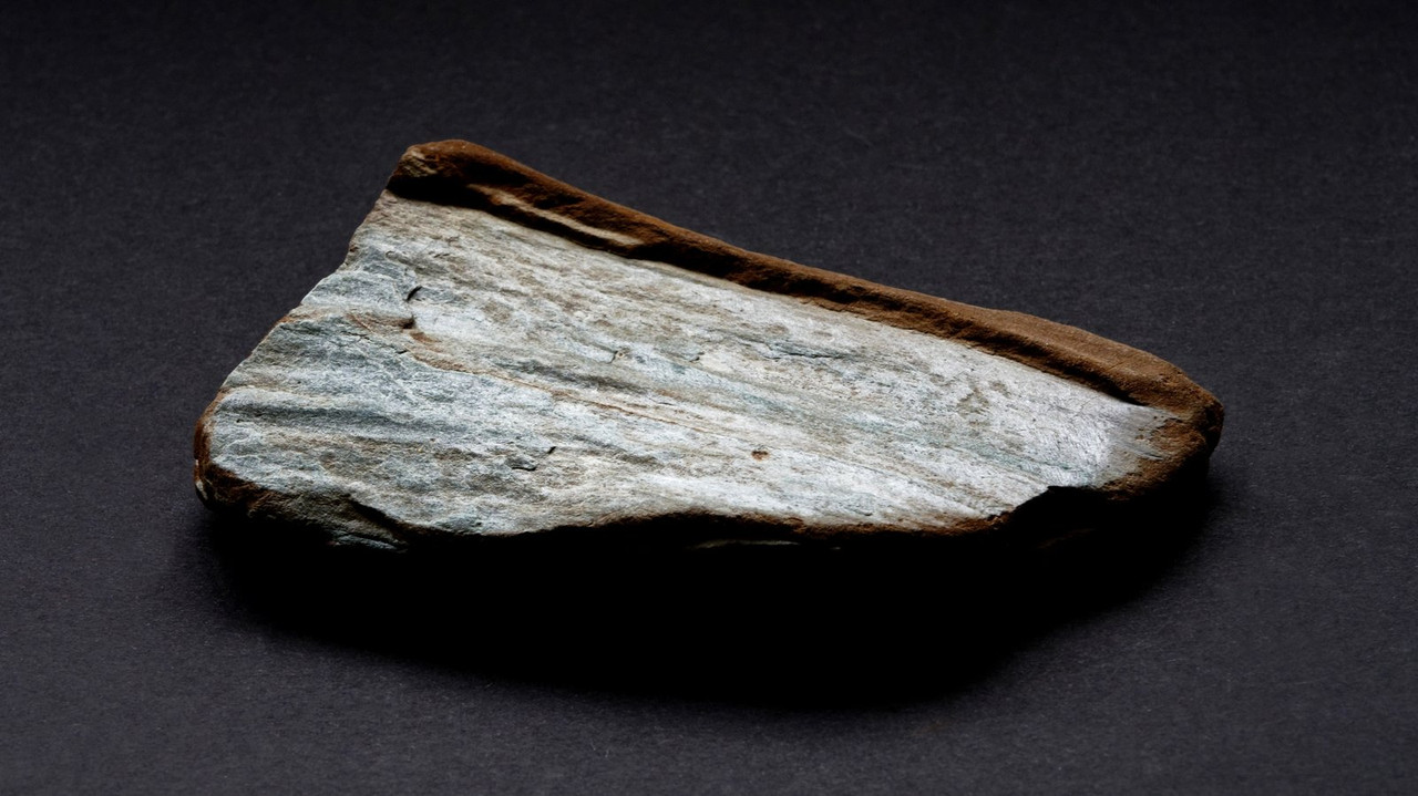 Zwei Makros von Handstücken will ich noch dranhängen. Am Tonschieferstück sieht man noch schön die Herkunft der Phyllite aus den Tonmineralien. Nur die dünne, glänzende Schicht ist metamorph umgewandelt. (Fundort: Flims, Graubünden)