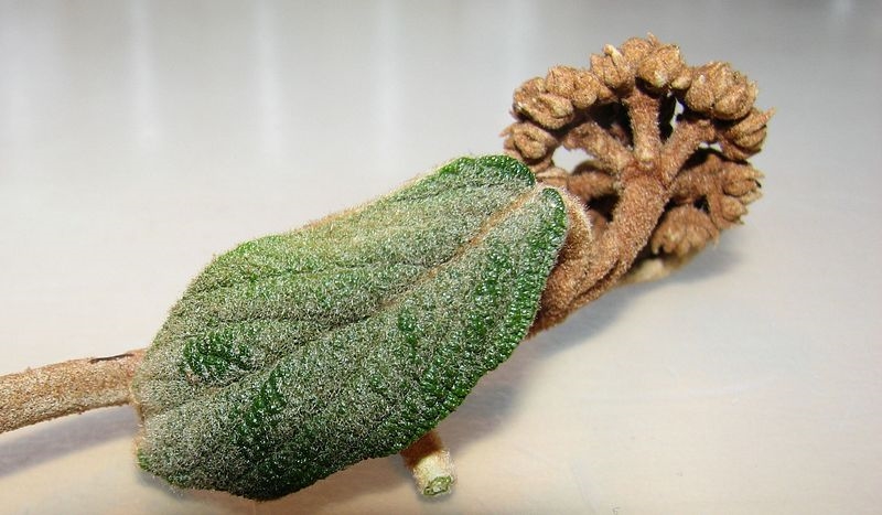 Die jungen Triebe, Blätter und Knospen sind sehr stark behaart, ich möchte fast sagen 'bepelzt':