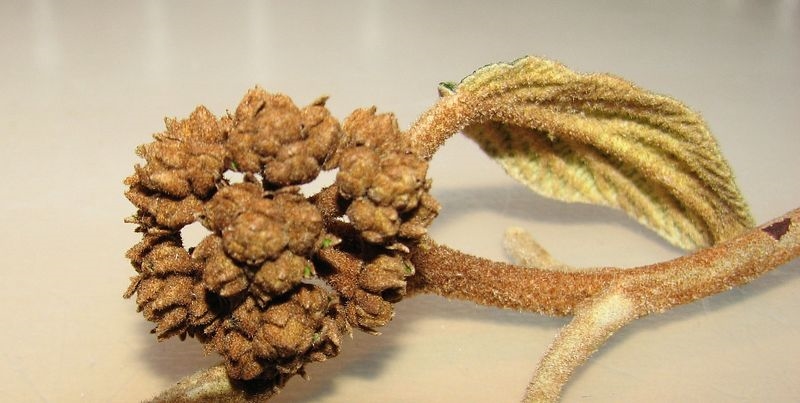 Bild 1: Runzelblättriger Schneeball mit Knospen, die hängenden Blätter sind schön zu erkennen