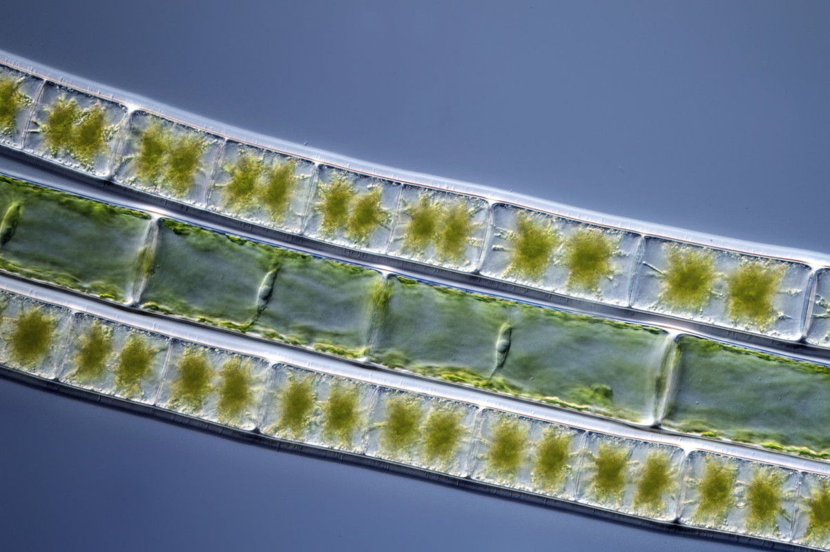 Im DIK 50 versuchte mal zwei Aufnahmetechniken. Zuerst eine Einzel-Aufnahme, die auf die Zellkerne der Schraubenalge fokussiert ist. Als Zweites das gleiche Motiv aus 4 Aufnahmen gestackt, sodass man die gelappten Chloroplasten zusammen mit dem mittigen Nukleus von Spirogyra sieht.