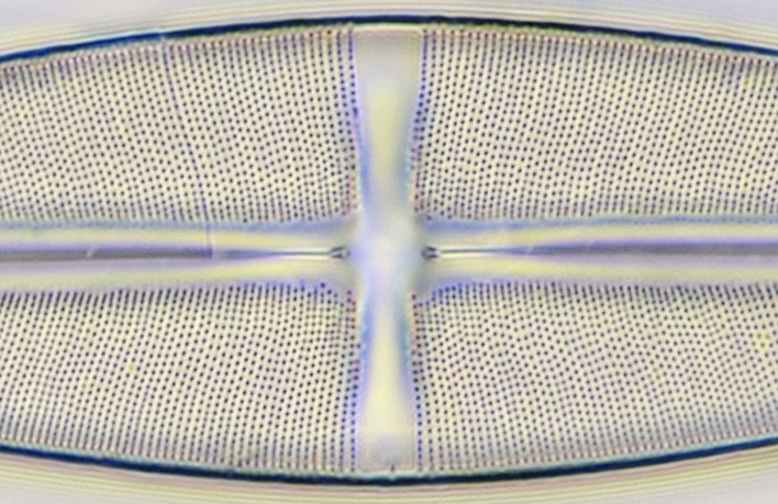 Die Achromaten solten nicht unterschätzt werden. Es hängt auch von die Art Beleuchtung und Objekt ab ob da zum Beispiel Farbsäume sind. Die Stauroneis gibt mit Achromaten in Algemeinem ziemlich stärke Farbsäume in Hellfeld. Die Bilder hier unten wurden auch mit Achromaten aufgenommen und mit die hier beschrieben schiefe Beleuchtung: