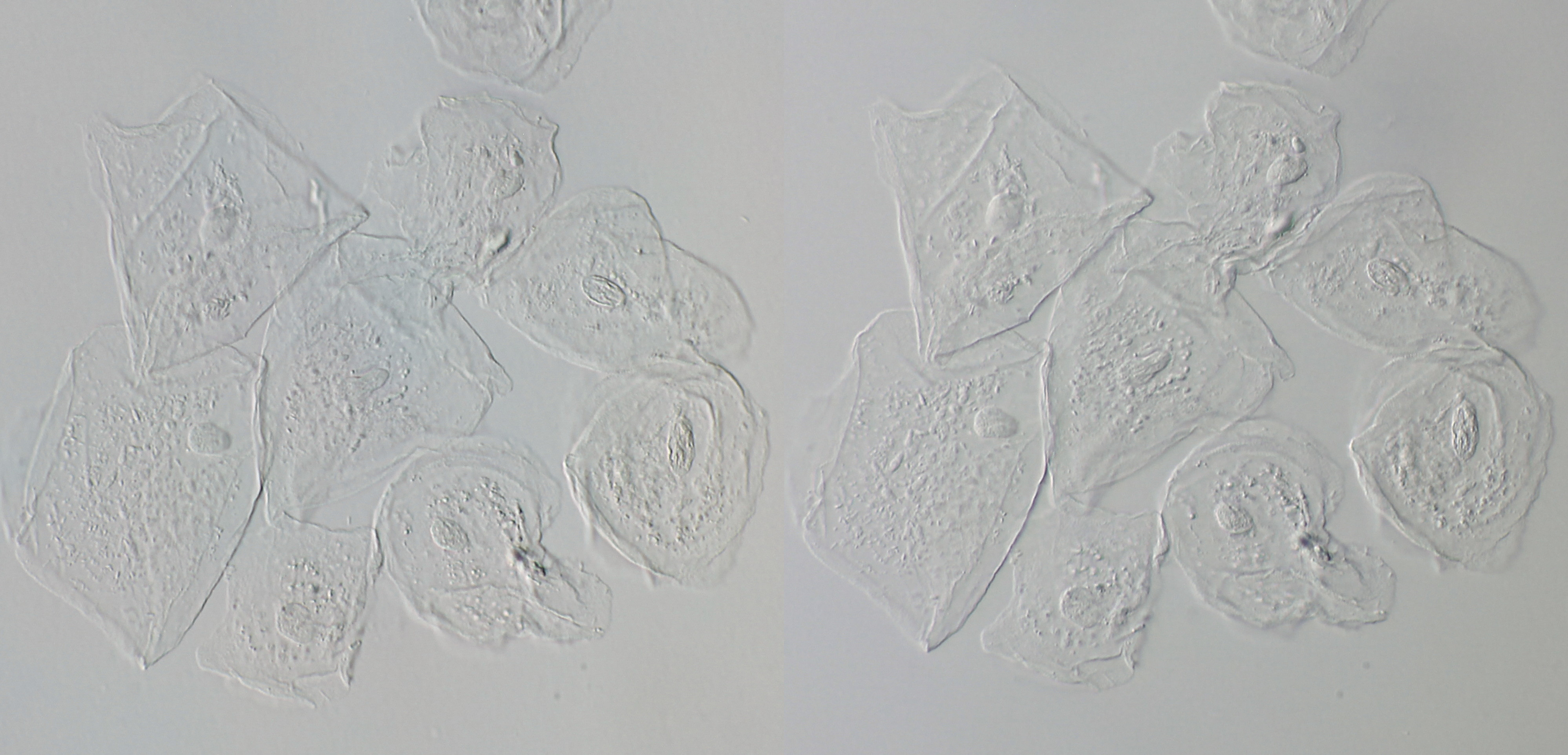 Ich habe hier nog einen Vergleich, Schleimhautzellen aufgenommen mit Leitz NPL Fluotar 25/0.55: