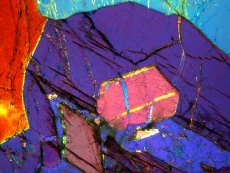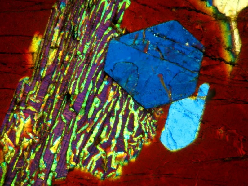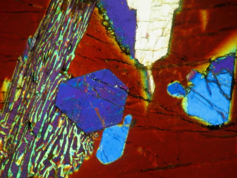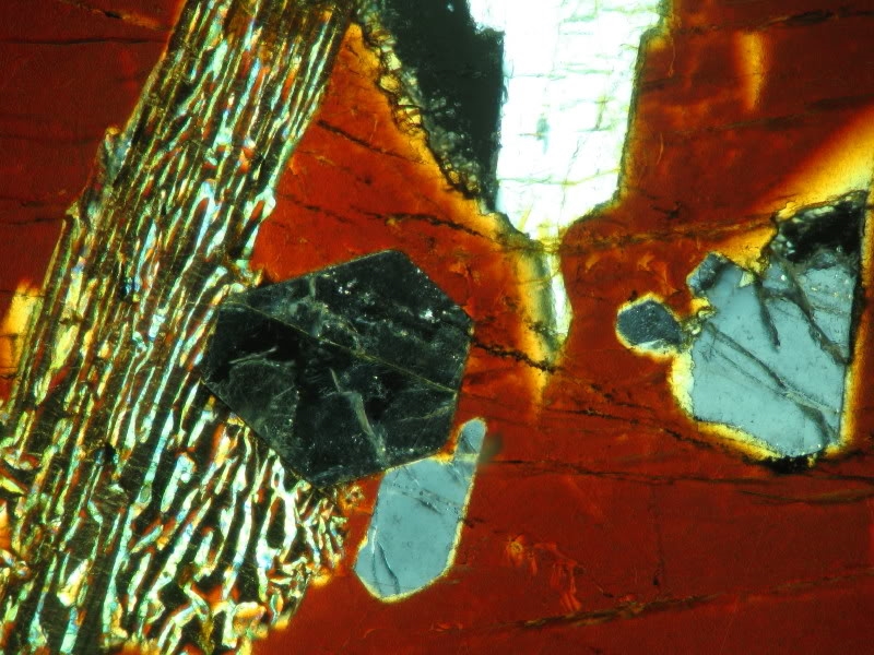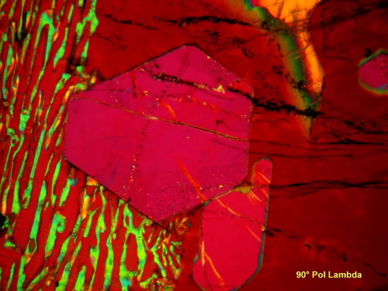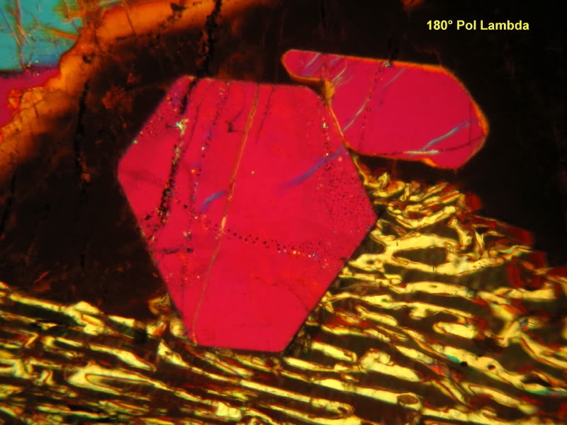 Ein Detail bei 100facher Vergrößerung gefiel mir besonders: wohl ein Amphibolkristall senkrecht zur Hauptachse getroffen. Einmal gekreuzte Polarisatoren und dann noch mit Lambda. Links neben dem Kristall vermute ich einen "Schriftgranit". Die Verwachsung von Quarz mit einen Alkalifeldspat.