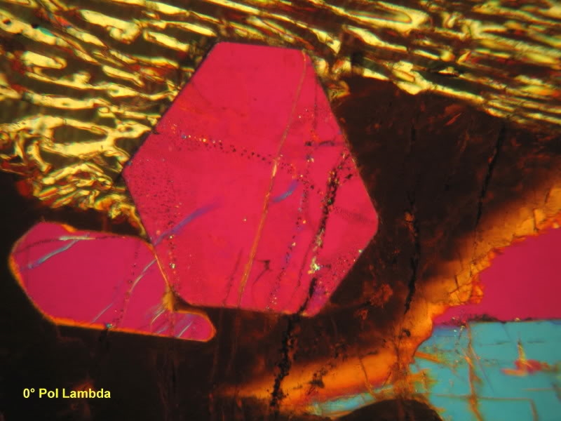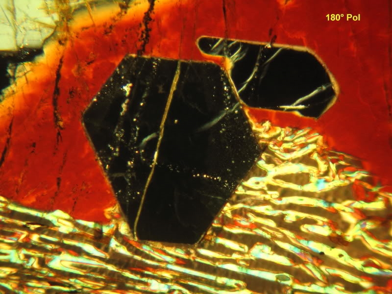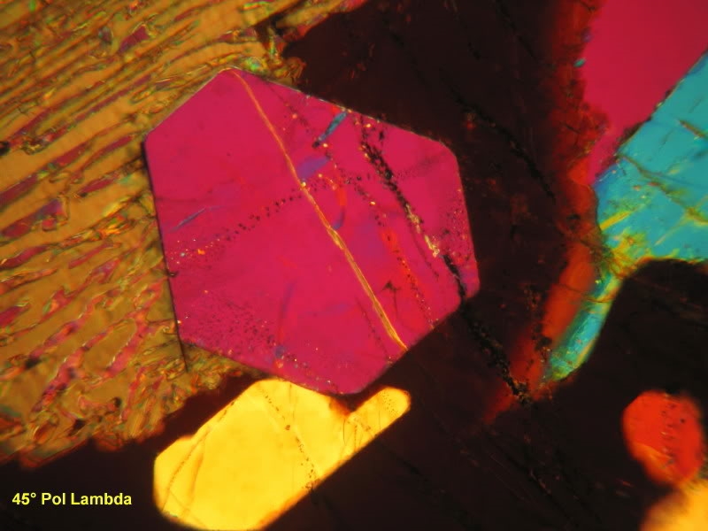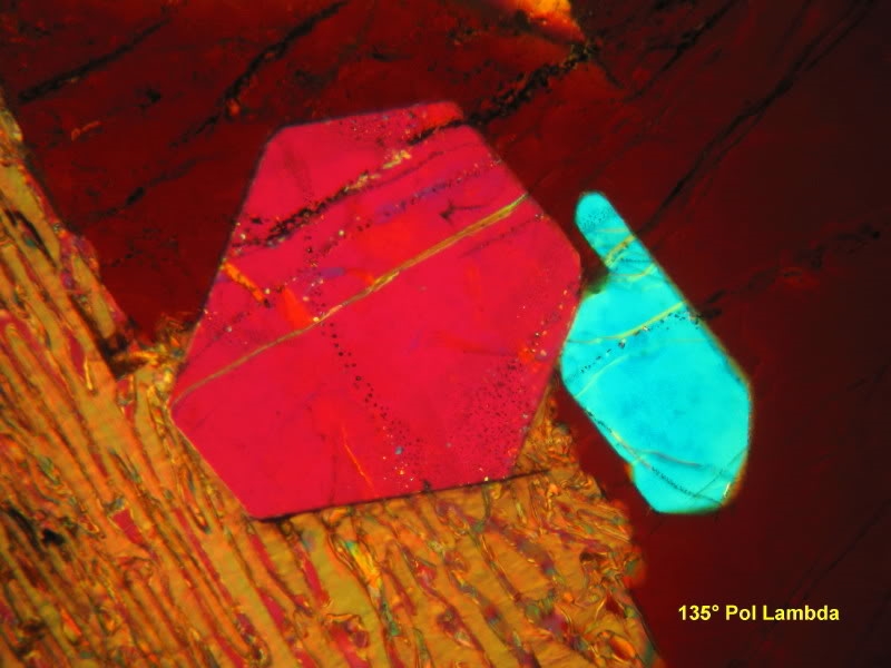 tun wir mal so als wäre es ein Apatit ;) dann ist der genau senkrecht zur optischen Achse geschnitten. Da er einachsig und hexagonal ist, verhält er sich in dieser Vorzugsrichtung isotrop, er zeigt keine Doppelbrechung; linear polarisiert immer hell und polarisiert immer dunkel - mit Lambda immer rot.