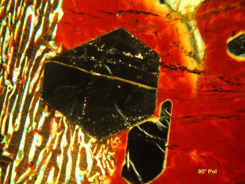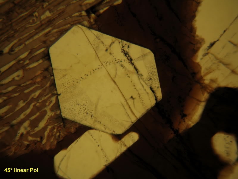 ist denn der große sechseckige Kristall in den Stellungen zwischen den abgebildeten Stellungen hell? Oder ist er immer schwarz (in Abwesenheit des Quarz-RotI-Plättchens)? Normalerweise werden doppelbrechende Kristalle beim Drehen des Tisches ja nur alle 90° schwarz, nicht alle 45°. Das ist ja merkwürdig.