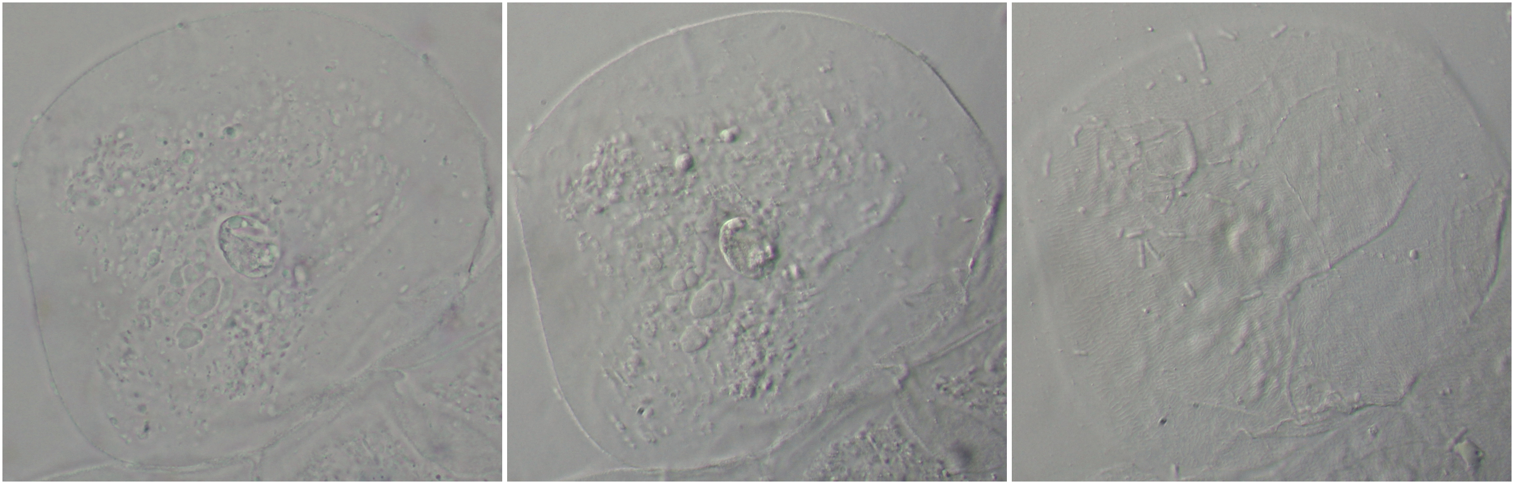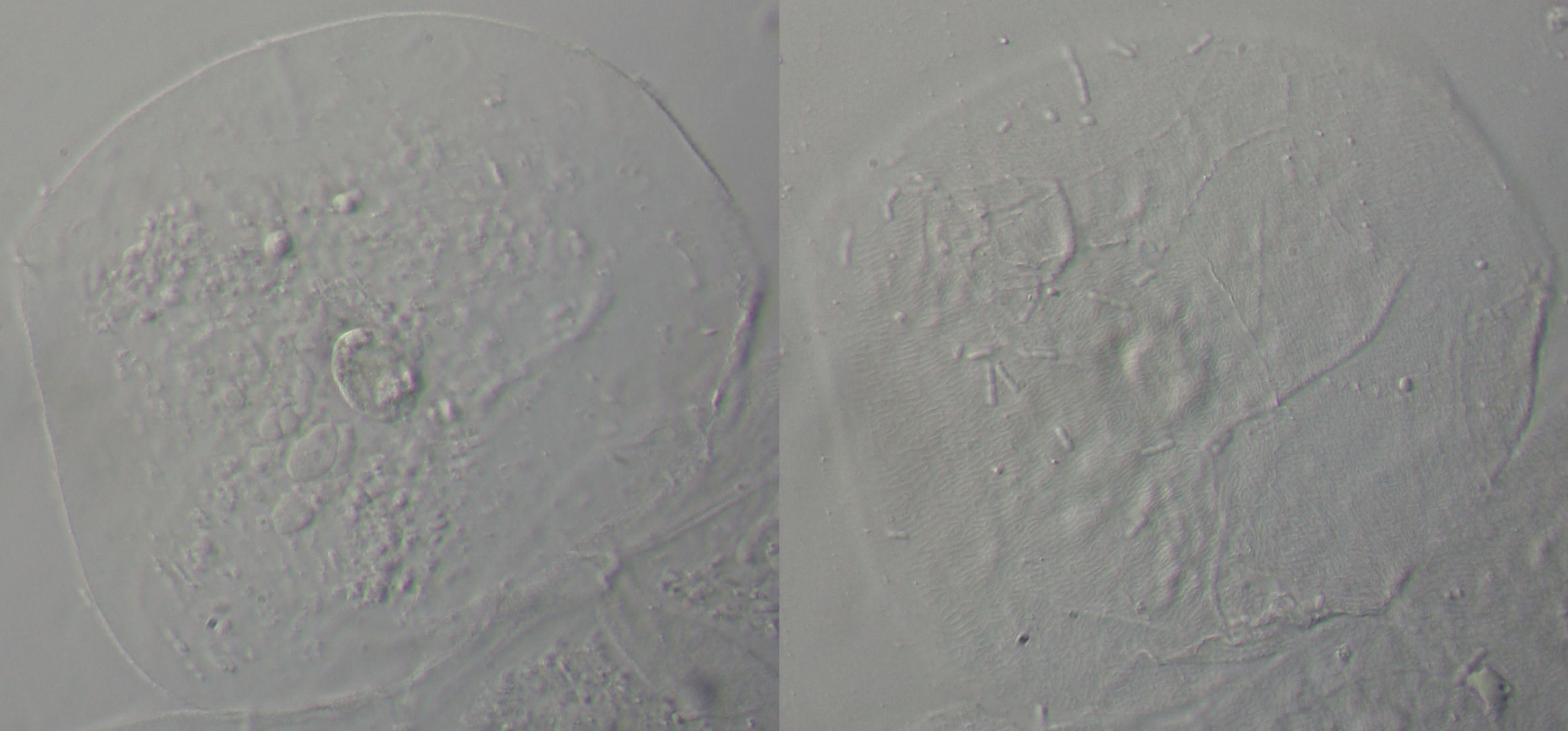 Für die schiefe Beleuchtung fehlt mir der genaue quantitative Vergleich ob mit ihr etwas schlechter einzelne Schichten im Objekt beobachtet werden könne als mit DIK. Aber prinzipiell ist schiefe Beleuchtung hier viel vergleichbarer mit DIK als mit Zernike-Phasenkontrast. Nach meinen Beobachtungen lassen sich mit schiefer Beleuchtung sehr gut einzelne optische Schichten getrennt fokussieren, ohne starke Beeinflussung durch höher oder tiefer liegende Schichten (das sieht man im ja auch an Deinem Beispiel).