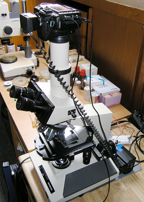 Das Mikroskop ist ein BHS mit DIK und Endlich-Optik. Die Kamera ist eine Pentax istDS und der Blitz, der da so hingefallen hinter dem Mikroskop liegt, ist ein alter Mecablitz 30 TTL 1. Über die Zusammenarbeit dieses uralten Metz-Blitzgeräts mit der istDS hat Rainer Schubert schon vor Jahren geschrieben. Man findet seinen Artikel hier: