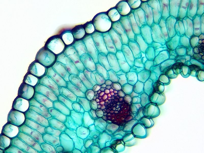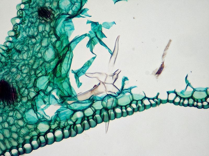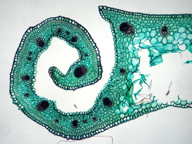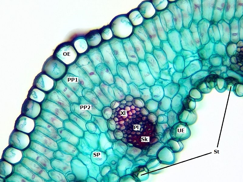 Der Blattaufbau von links nach rechts: eine einzellige Epidermis aus großen Zellen mit einer dünnen Cuticula, gefolgt von einem zweireihigen Palisadenparenchym und dem Schwammparenchym, in dem das Leitbündel mit seiner Sklerenchymkappe sitzt. Den Abschluss bildet wieder eine Epidermis aus einer Zelllage.