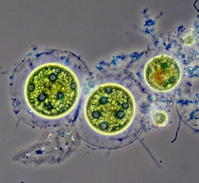 Ich poste hier jetzt noch aus dem gleichen Biotop, was ich als Dauerstadien der Stephanosphaera pluvialis (2 grössere Zysten), bzw. des Haematococcus pluvialis (kleine Zyste) ansehe. Die kleine Zyste trägt deutlich das für Haematococcus typische rote Pigment !