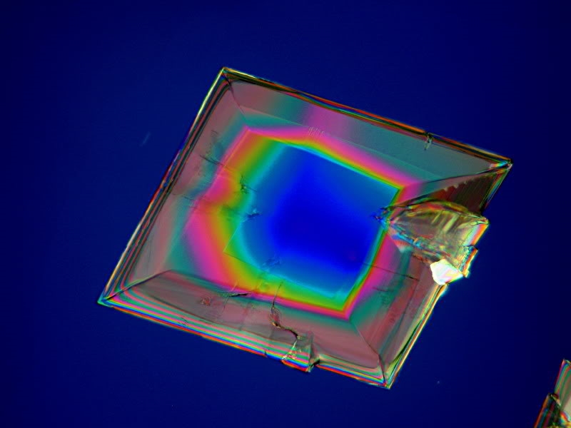 das ist tatsächlich die Lösung, also sowas wie ein kubistischer Eierbecher wie passend! Ich habe das Bild mal hochvergrößert und da sieht man es deutlich, am besten an der linken unteren Kante. Der Kristall hat eine steile Flanke, die "Interferenzfarbleiter" geht drei Stufen (Rotstreifen) nach oben, dann hat er ein flaches Plateau, das sich sanft nach innen neigt (breite Rot-Grün-Streifen, und in der Mitte eine Depression. Da sieht man dann wieder das empfindliche Violett an der Grenze zwischen erster und zweiter Ordnung.
