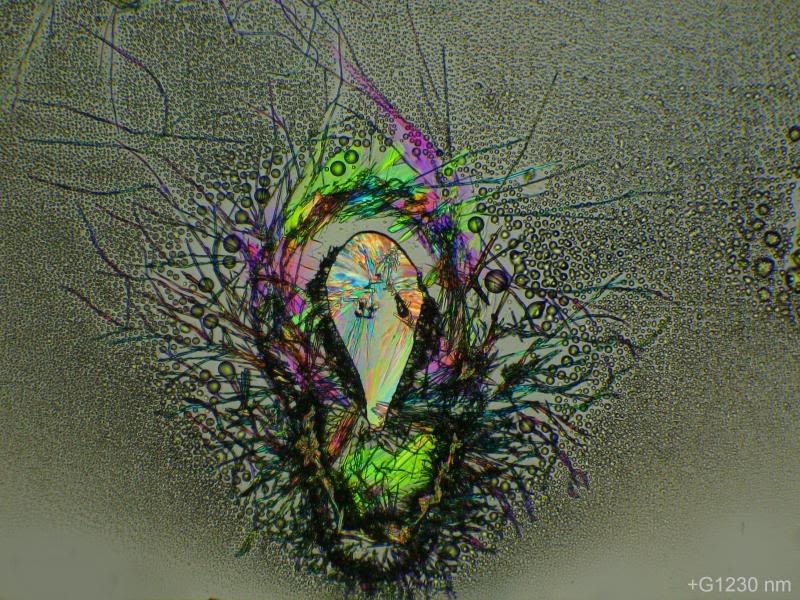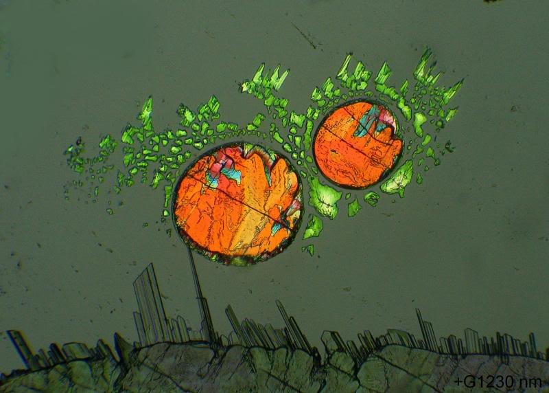 nach so viel schönen Ostereiern kommt noch ein Feiertagsbeitrag zum Phantasieanregen. Beide Bilder aus Schmelze, mit Obj. 10x, polarisiert mit Hilfsobjekt Glimmer 1230 nm. Die "Titel" sind natürlich subjektiv und unverbindlich.