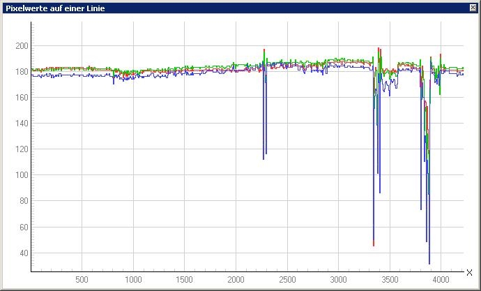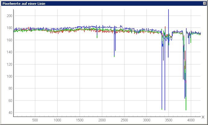 Auswertung des Intensitätsverlaufs. Somit ca. 7% Lichtabfall zum Rand gegenüber der Mitte, aber keine erkennbare Farbabweichung.