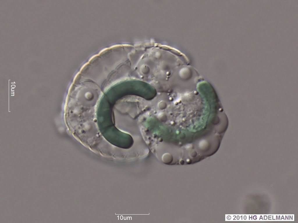 Martin hat Recht, es ist eine Paulinella. Ich hab vor zwei Wochen diese Bilder von Paulinella gemacht. Sie lebte in treibende Detritus wie man das oft im Frühjahr im Gewässer sieht. Die erste Paulinella hat zwei Cyanobakterien, wie normal. Die zweite Paulinella hat sich geteilt. Bei der Zweiteilung geht eines der Cyanobakterien mit in das Cytoplasma der 'neue' Paulinella. Nach einige Zeit teilt sich auch diese Cyanobakterie.