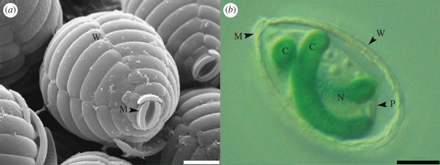 Martin Kreutz hat ja bereits in diesem Thread auf die evolutionsbiologische Bedeutung der Chromatophoren dieser Thecamöbe hingewiesen. Nowak und Melkonian schreiben zu den Symbionten auch noch: "A high level of symbiotic integration of the chromatophores is implied by the strict synchronization of chromatophore division with the host cell cycle (Hoogenraad 1927)" sowie "The chromatophores are enclosed by a membrane of unknown origin and are located in the cytoplasm of the amoeba. They resemble in colour and ultrastructure (possession of carboxysomes, unstacked thylakoids and a peptidoglycan wall) cyanobacteria of the genus Synechococcus (Kies 1974) - however, they are roughly 20 times larger than freeliving Synechococcus spp".