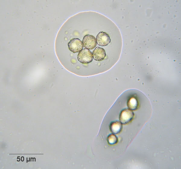 ich rate mal ins Blaue hinein: Kondensat aus dem Morgennebel mit Pollen? Da hättest Du dann einfach ein Deckglas über Nacht draussen gehabt ...  :)