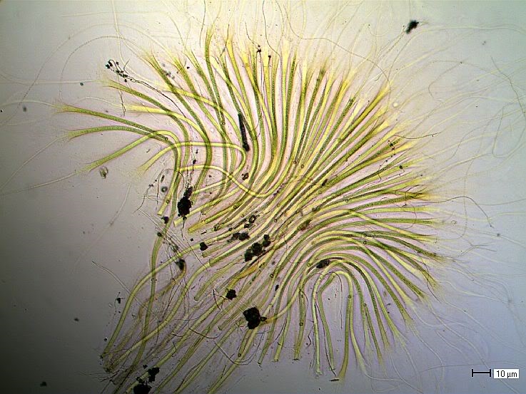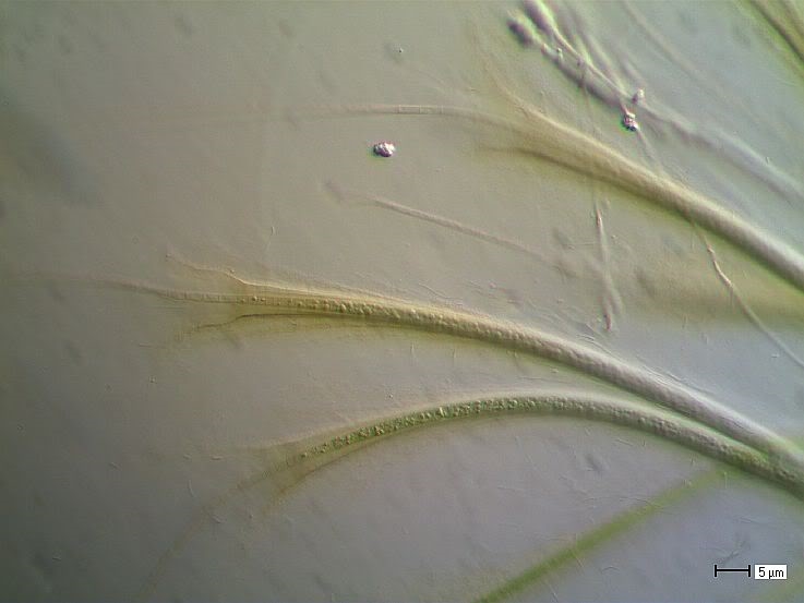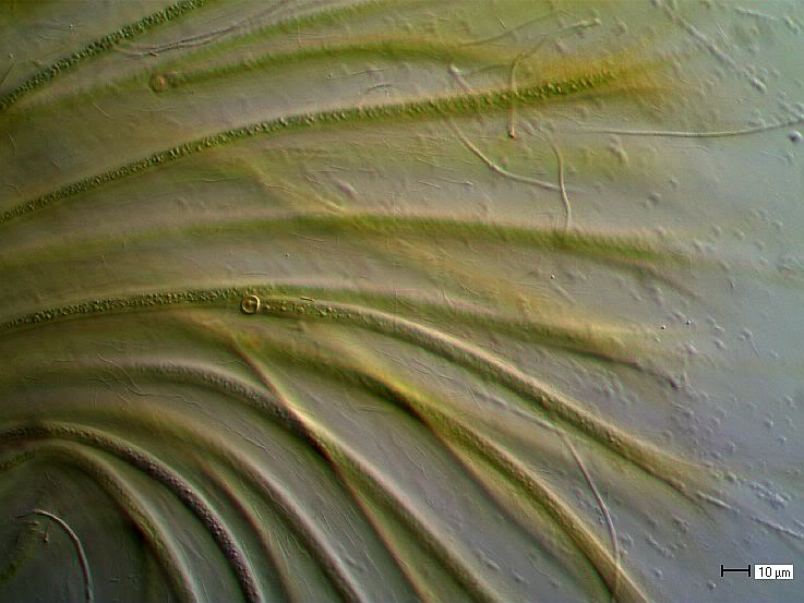 heute ist mir ein Objekt begegnet, dass mich zunächst stark an die Blaualgen der Gattung Calothrix erinnert (Bipolarität, Gallertscheide und Heterocyste an der Basis der Stängel). Im Streble/ Kauter sieht sie einer Rivularia biasolettianea am ähnlichsten. Kennt vielleicht jemand diese Blaualge?