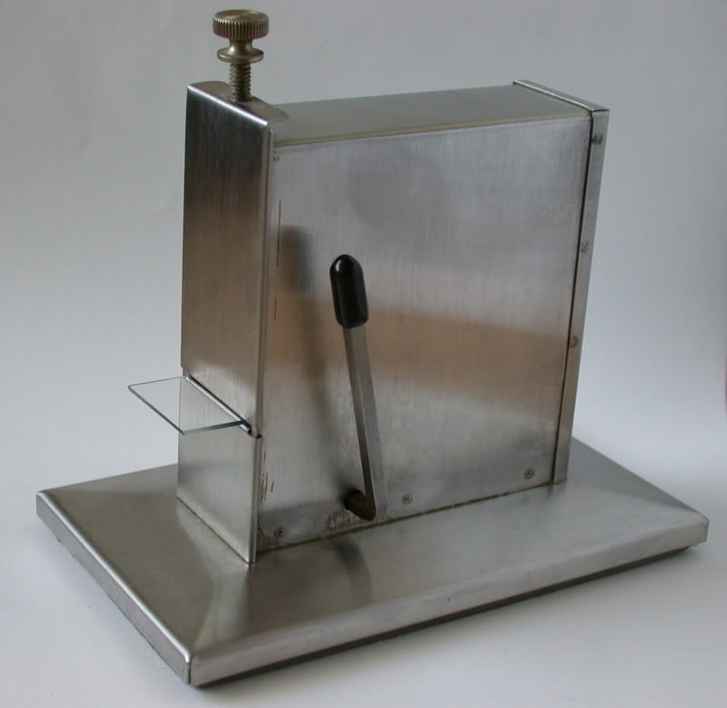 Das Gerät ist stabil gebaut (gebogenes Edelstahl?) und funktioniert einwandfrei. Der Griff rechts wird nach vorne/unten gedrückt und ein Objektträger kommt vorne raus. Noch nie hat da was geklemmt.