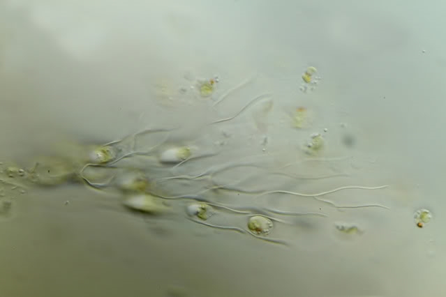 man muss zum Tümpeln nicht immer weit laufen. Manchmal tut es auch schon der Besuch in Nachbars Garten. In einer Wassertonne, mit Entengrütze fast vollständig bedeckt, fand ich diese Dinobryon.