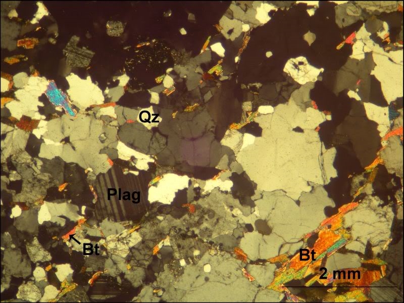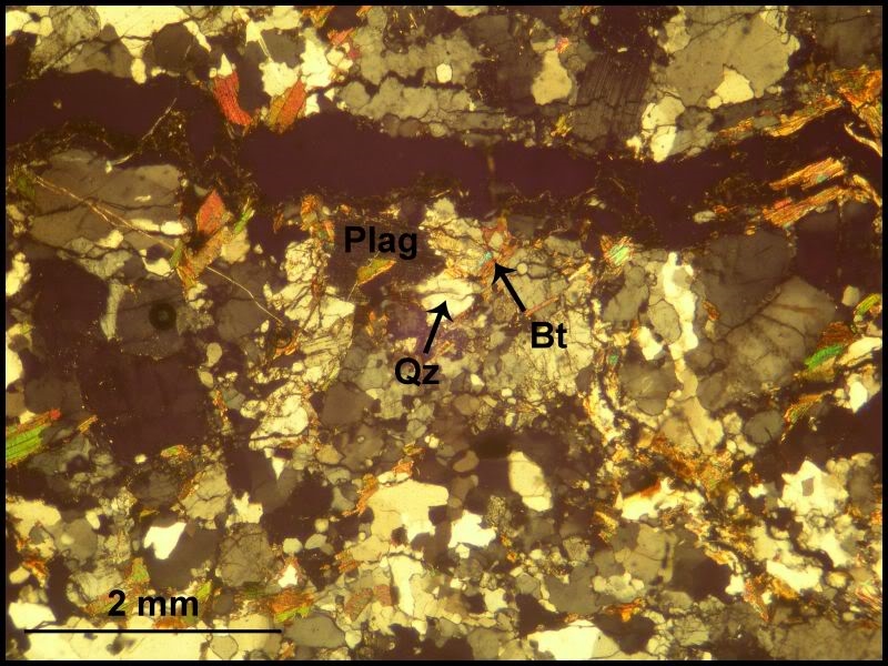 von Naxos habe ich aus dem hochmetamorphen Teil der Insel ein paar Dünnschliffe erstellen lassen. Makroskopisch bin ich mir bei der Bestimmung der Proben im Grunde mehr oder weniger sicher, allerdings habe ich bei den Dünnschliffen doch so meine Schwierigkeiten. In den Bildern habe ich exemplarisch die Phasen markiert die ich glaube gefunden zu haben. Qz: Quarz, Plag: Plagioklas, Bt: Biotit und MS: Muskovit. Ich weiß das die Ferndiagnose unmöglich ist, aber dennoch: Wie ist Euer Eindruck? Könnte das so stimmen und kann man mich anhand dieser Bilder recht leicht wiederlegen?