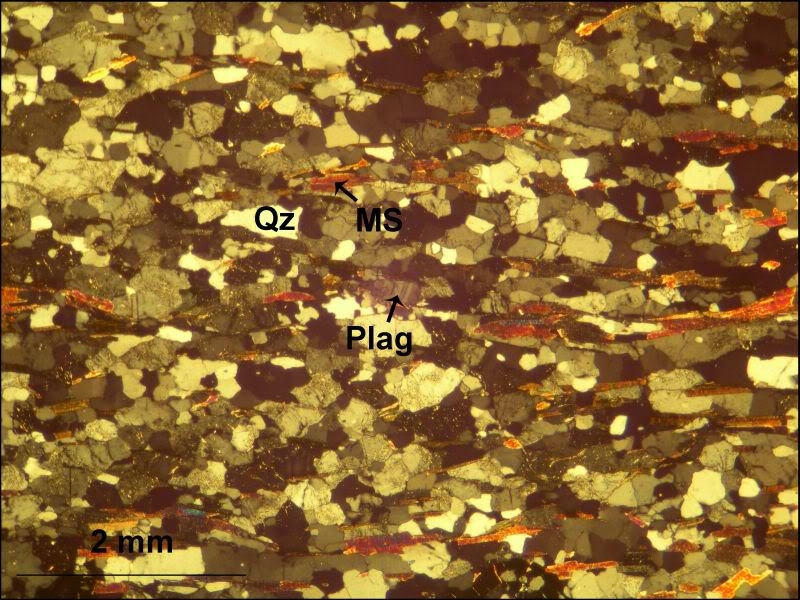Deine Bestimmungen scheinen soweit in Ordnung zu sein, aber es wären grundsätzlich auch Bilder im linear polarisierten Licht wünschenswert. Da ist dann die Unterscheidung zwischen Muskovit und Biotit besonders leicht - letzterer ist immer gefärbt und pleochroitisch. In Deinem zweiten Gestein (dem Gefüge nach eher ein Glimmerschiefer mit einer straffen Einregelung als ein Gneis???), glaube ich z.B., daß der von Dir mit Ms bezeichnete Kristall doch eher ein Biotit ist. Der Muskovit hat reinere Interferenzfarben. Im linear polarisierten Licht findest Du dann auch die hoch lichtbrechenden Phasen Zirkon, Titanit und Granat besonders leicht.