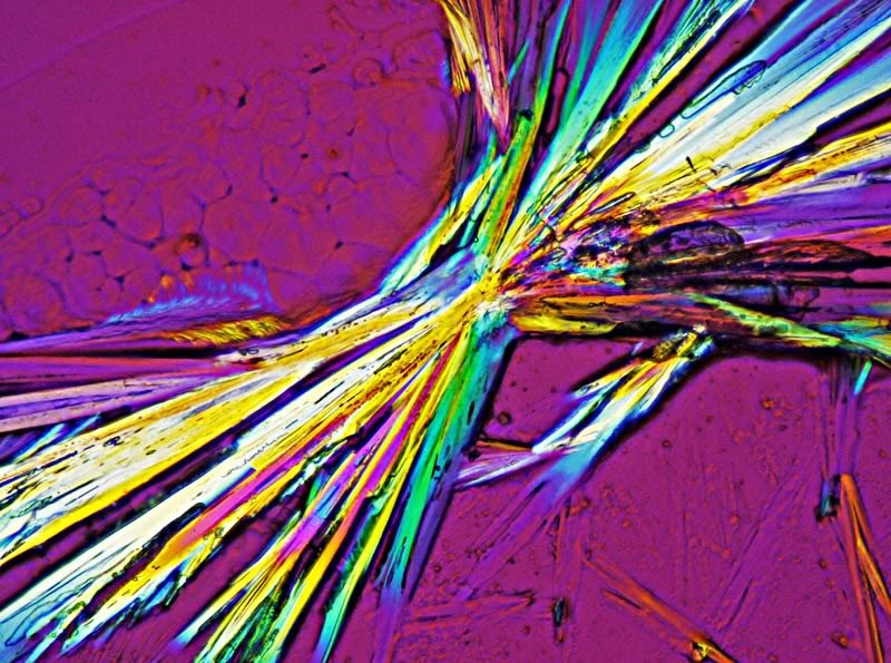 hast du in Deinen vielen Proben, Zutaten und Extrakten auch reines Vitamin D? Dann könntest du ausprobieren ob dies solche Kristalle bildet. Vorausgesetzt du hast eine Polarisationseinrichtung an deinem Mikroskop.