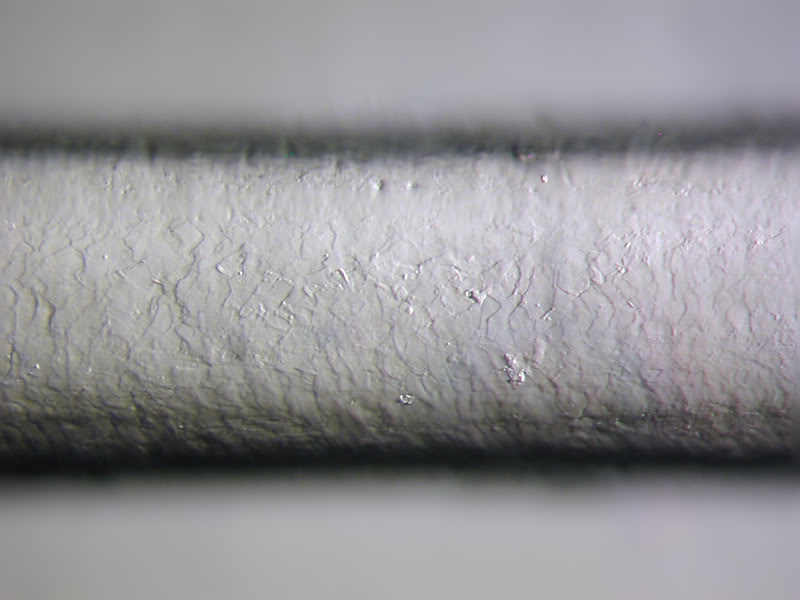 Häckchen oder sonstig widerborstiges sehe ich jedenfalls nicht, nur diese Schuppen (bei 200x , schiefe Beleuchtung). Ich werde mal ein etwas länger gespieltes Haar von meinem Drittbogen vergleichen.